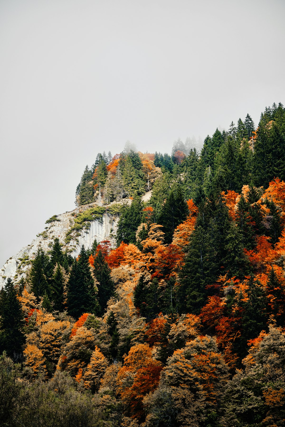 Fall colors blanketing mountainsides — oranges, reds, and yellows against rocky peaks.